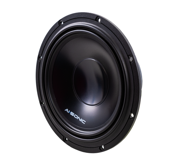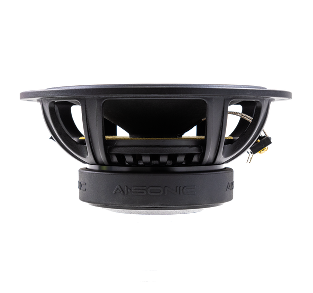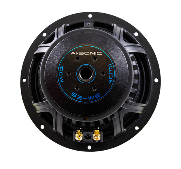 AI-Sonic S3-W6 laadukkaat elementit joissa on alumiinista ja paperikomposiitista valmistettu musta kartio sekä kumiripustus.