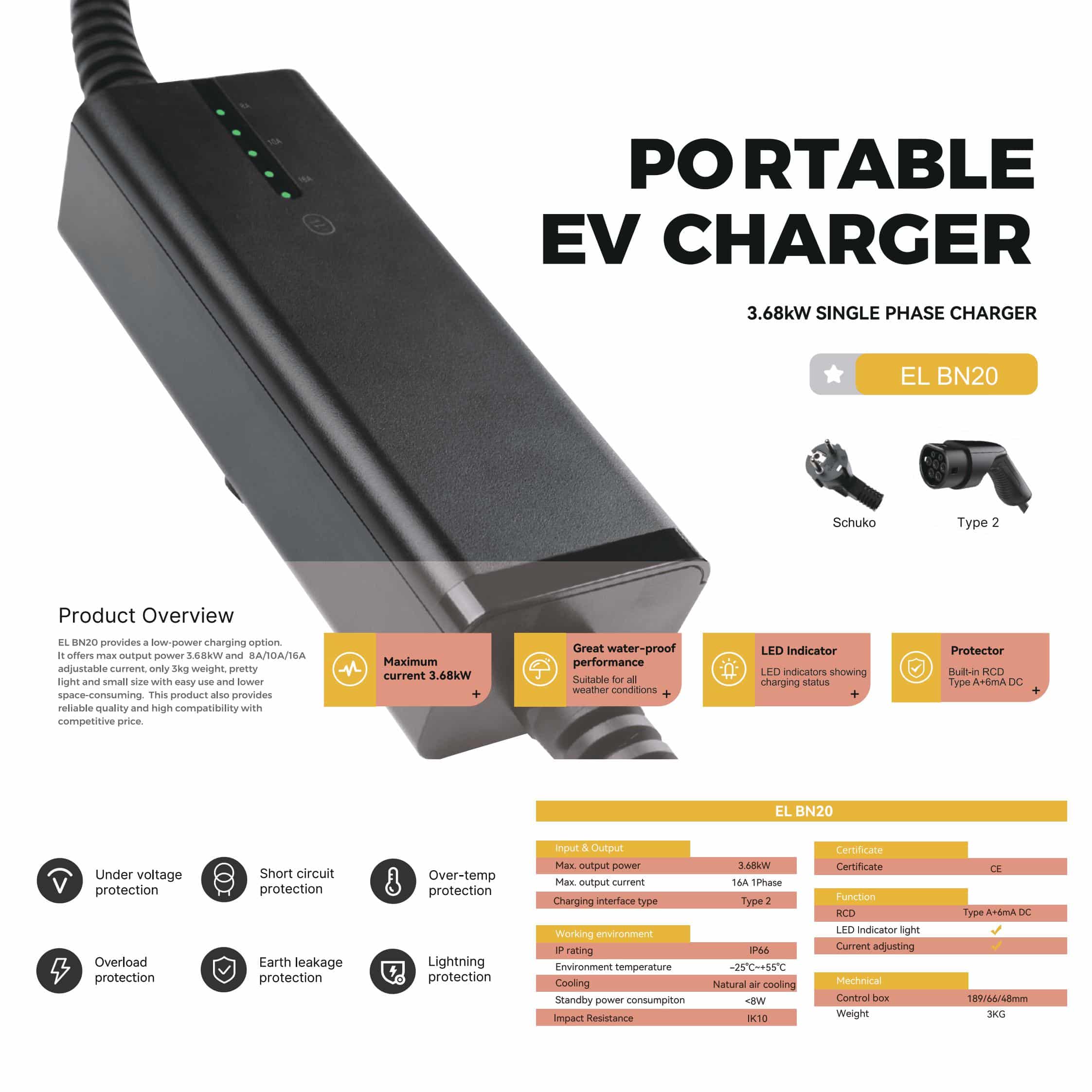 EL BN20 on kompakti ja helppokäyttöinen kannettava sähköauton latauslaite, joka muuttaa tavallisen 230 V Schuko-pistorasian turvalliseksi latauspisteeksi. Se on erinomainen ratkaisu kotiin, mökille tai matkalle, kun kiinteää latausasemaa ei ole saatavilla.