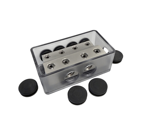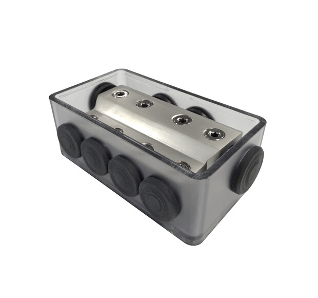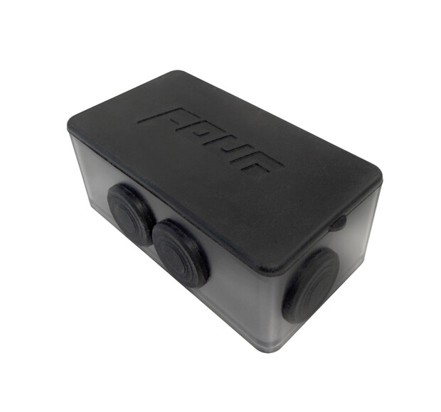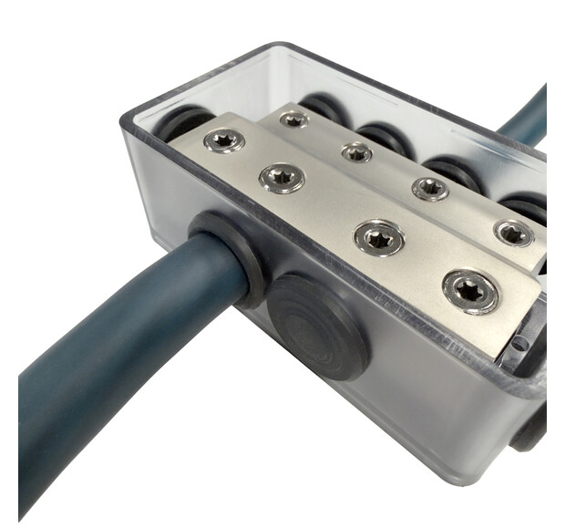Tässä jakoblokissa on avattava kansi, joka on joustavaa kumia. Runko on säänkestävää muovia ja pohjassa olevien reikien avulla voit kiinnittää sen ruuvaamalla paikoilleen.
