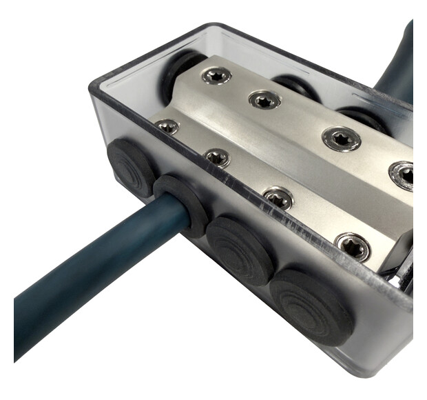 Kaapeleiden sisään / -ulostuloissa on kumiset tiivisterenkaat, jotka voidaan muokakata sopivaksi kaapelin paksuuden mukaan. Blokkien sisällä on asennusholkit, joiden avulla saat kiinnitettyä kaapelit todella tukevasti paikoilleen.