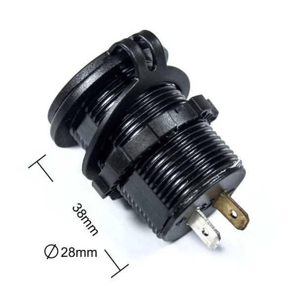 Tupla USB-laturi jännitenäytöllä. Voidaan uppoasentaa 27 mm aukkoon, toimii sekä 12 että 24 voltin järjestelmissä.