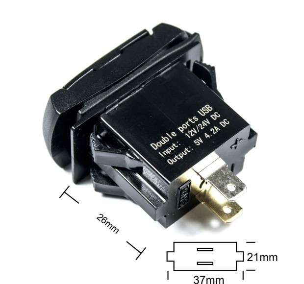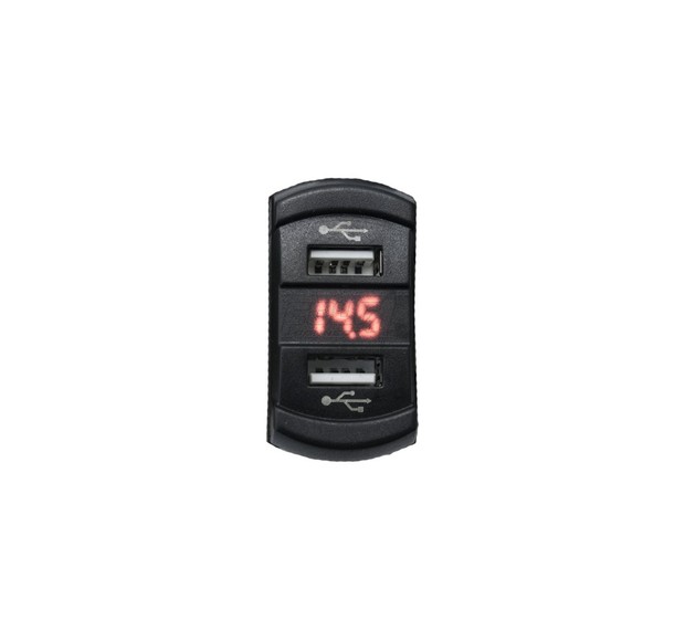 Tupla USB-laturi jännitenäytöllä. Voidaan uppoasentaa 21×37 mm aukkoon, toimii sekä 12 että 24 voltin järjestelmissä.