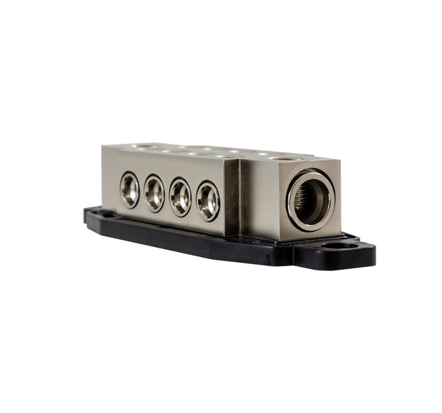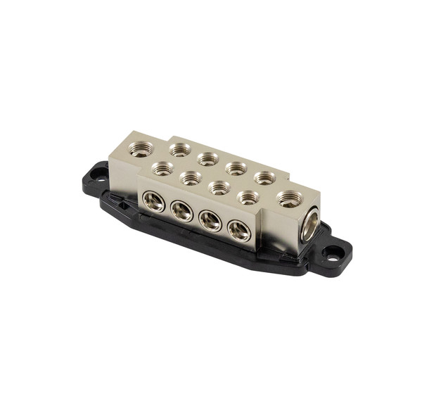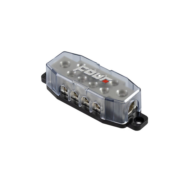 FOUR Connect STAGE2 jakoblokissa on 2×50/20mm2 sisäänmenot ja 8×20/10mm2 ulostulot virtakaapeleille.