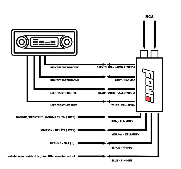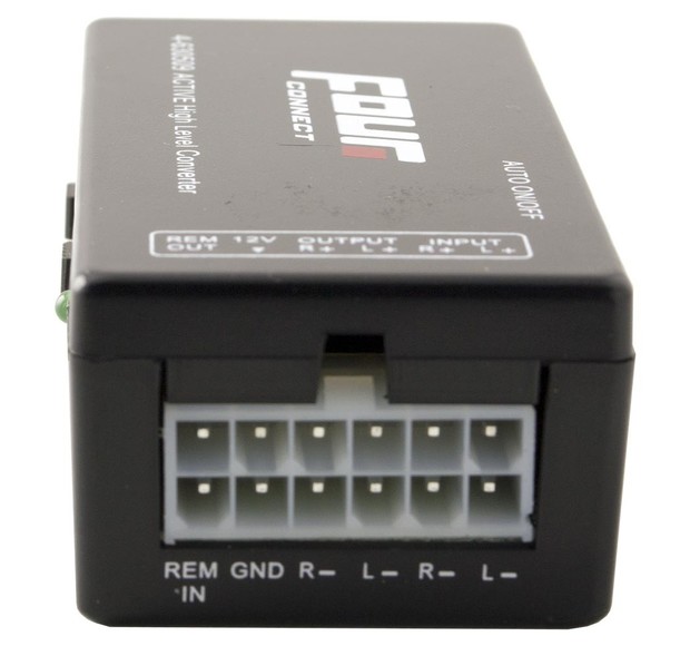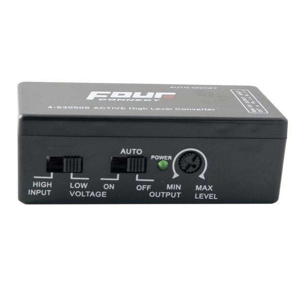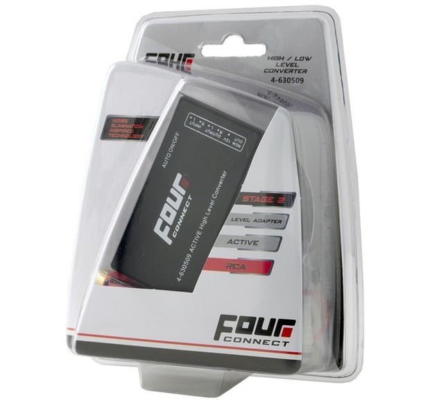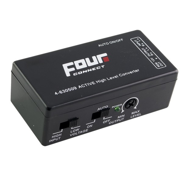 FOUR Connect 4-630509 on 2-kanavainen aktiivinen linjamuunnin. Voit muuttaa yhden parin kaiutinlähtöjä RCA-lähdöiksi. Aktiivinen linjamuunnin antaa paremman äänenlaadun kuin halvempi passiivinen muunnin. Tässä tuotteessa on yksi erinomainen ominaisuus: TASONSÄÄTÖ.