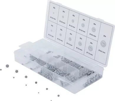 Sisältää: 50 x Ø 2.0 mm 50 x Ø 2.5 mm 50 x Ø 3.0 mm 50 x Ø 3.5 mm 50 x Ø 4.0 mm 50 x Ø 4.5 mm 50 x Ø 5.0 mm 50 x Ø 5.5 mm 30 x Ø 6.0 mm 20 x Ø 7.0 mm 20 x Ø 8.0 mm