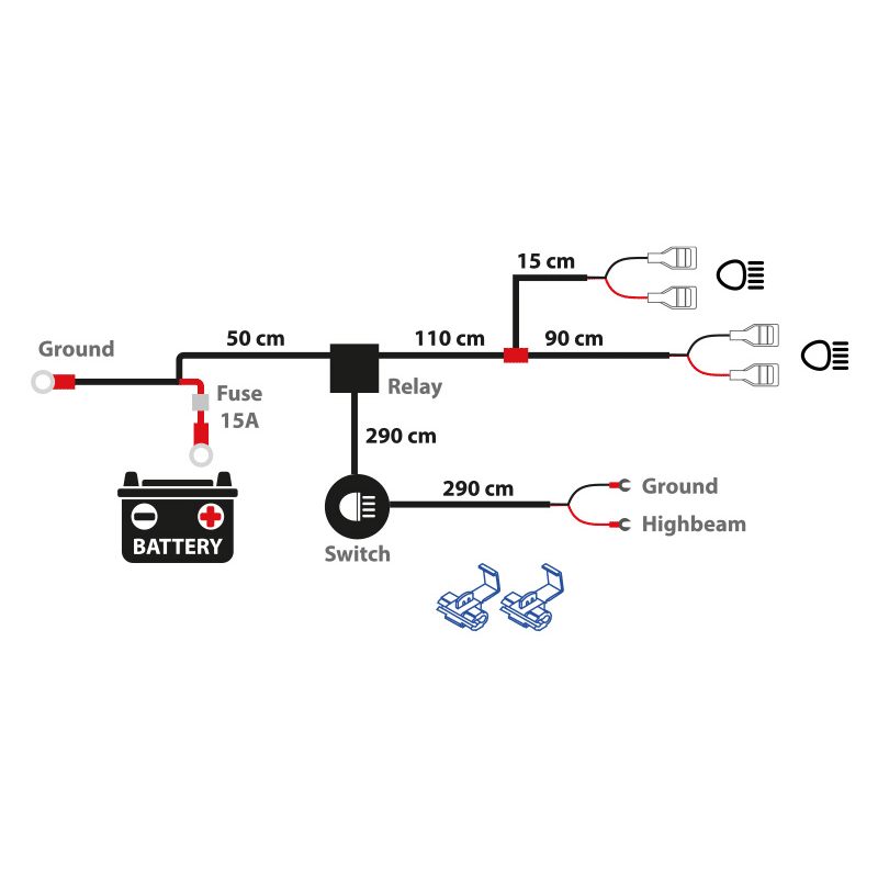 Jännite: 12V Kuvaus: valoille, led-keinukytkin (as.12mm reikäään) + rele + johtosarja, punainen led, sulake 15A. Max 160W