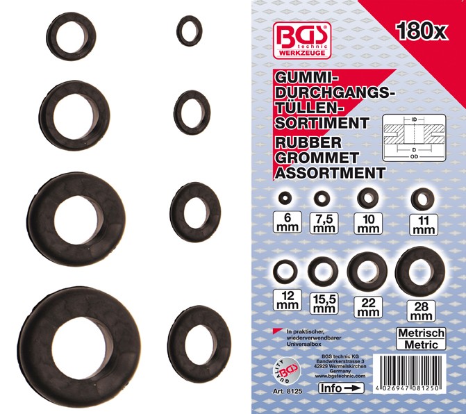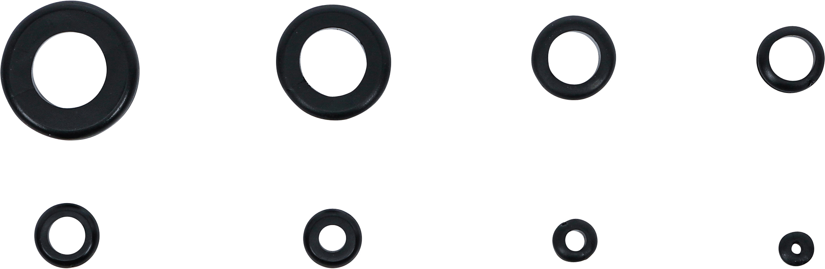 Muovilaatikossa 5 x Ø 22 mm, sisä Ø 15 mm, ulko Ø 26 mm 5 x Ø 15.5 mm, sisä Ø 12 mm, ulko Ø 19 mm 5 x Ø 28 mm, sisä Ø 17 mm, ulko Ø 32 mm 20 x Ø 12 mm, sisä Ø 11 mm, ulko Ø 15 mm 25 x Ø 11 mm, sisä Ø 9 mm, ulko Ø 15 mm 40 x Ø 10 mm, sisä Ø 6 mm, ulko Ø 13 mm 40 x Ø 7.5 mm, sisä Ø 5 mm, ulko Ø 10 mm 40 x Ø 6 mm, sisä Ø 3 mm, ulko Ø 8 mm