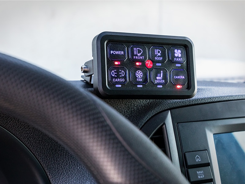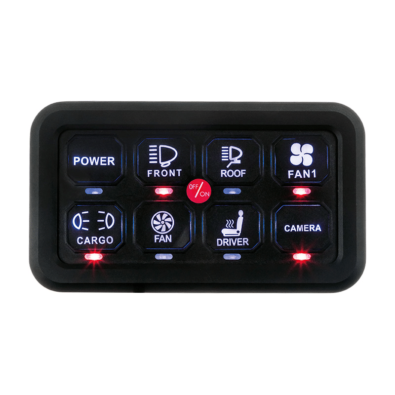 Kuvaus: OPTIBEAM ohjauspaneeli on tarkoitettu nopeuttamaan ja helpottamaan lisälaitteiden asennusta ja ohjausta erilaisissa 12V/24V käyttöympäristöissä kokonaisteholtaan aina 60 Ampeeriin asti. Erillisiä laitekohtaisia sulakkeita, releitä tai katkaisijoita ei enää tarvitse asentaa, vaan käytettävät toiminnot kytketään suoraan 8- kanavaiseen ohjausboxiin josta niitä käytetään omalla 8-nappisella käyttökytkimellä. Sopii mainiosti esimerkiksi ajoneuvon/ työkoneen varoitusvaloille, sisävaloille, työvaloille, puhaltimille ym.