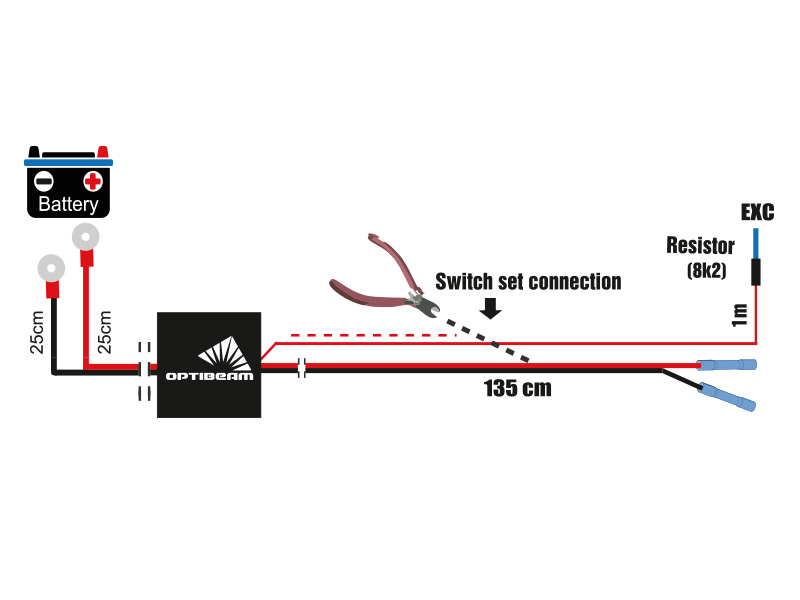 Yleismallinen kytkentäsarja yhdelle lisävalotangolle, jossa lyhyt virtajohto ilman pistoketta
